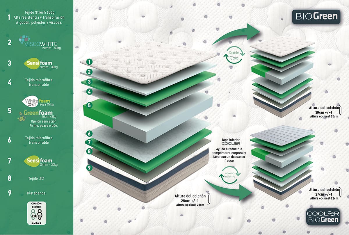 Este colchón está diseñado para utilizarlo por ambas caras, pues los componentes que aportan confort, adaptabilidad, y termorregulación están predispuestos a ambas caras.