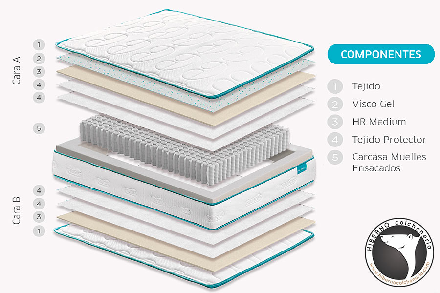 Este colchón está diseñado para utilizarlo por ambas caras, pues los componentes que aportan confort, adaptabilidad, y termorregulación están predispuestos a ambas caras.